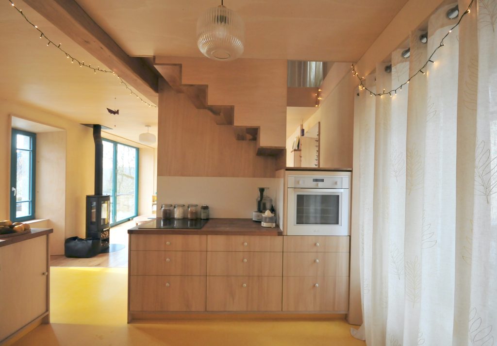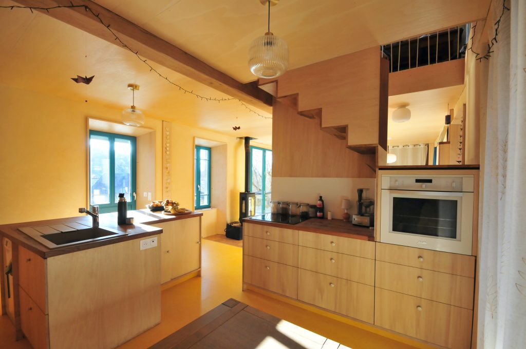 Le projet a donné lieu au re-emploi d’une partie des éléments déposés (fenêtres double vitrage, fenêtres simple vitrage, radiateurs acier, une partie des tuiles, solives chêne) et à l’utilisation de matériaux de seconde main (parquet chêne, contreplaqué pin, chêne des plans de travail et escalier).
