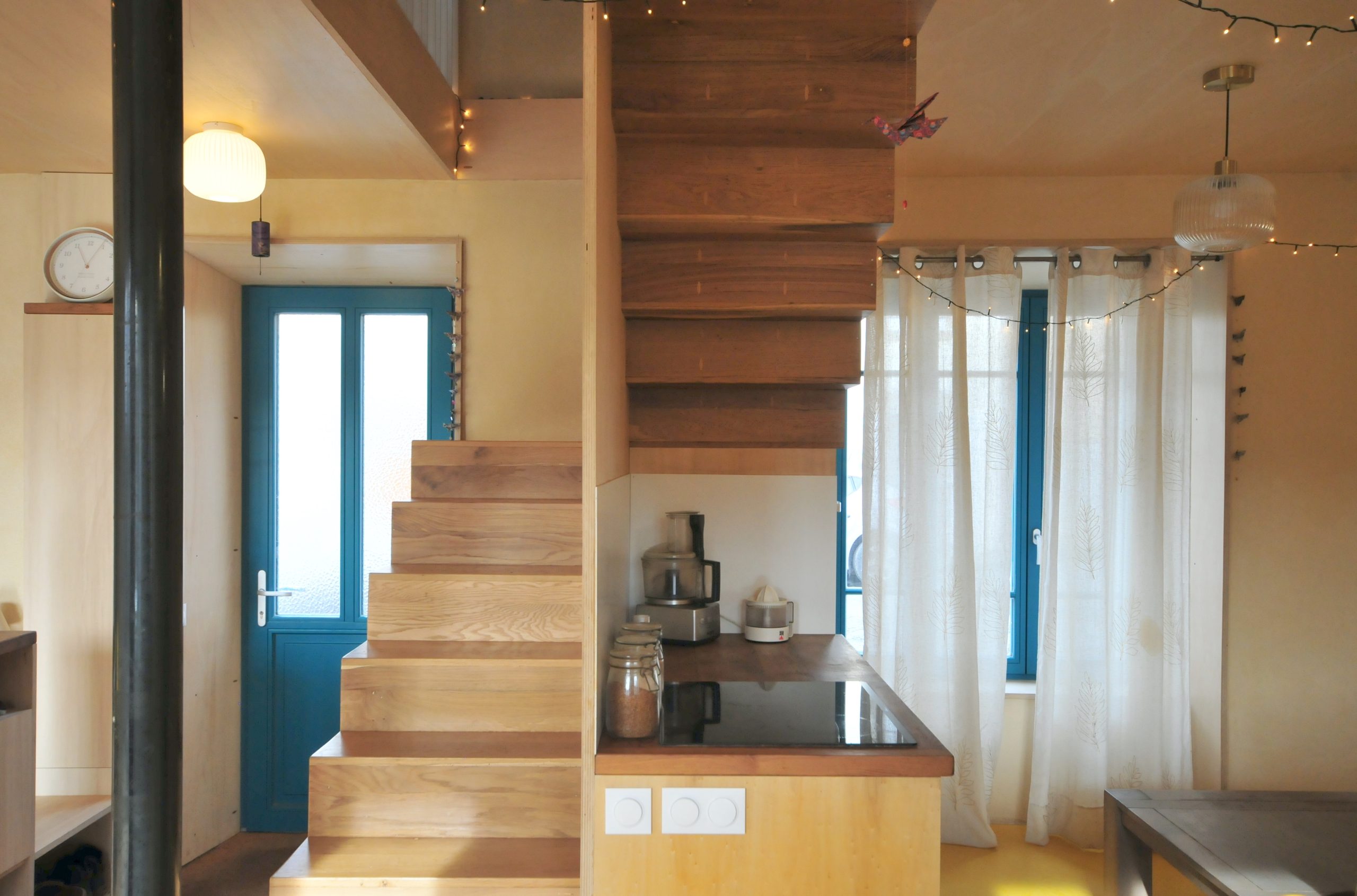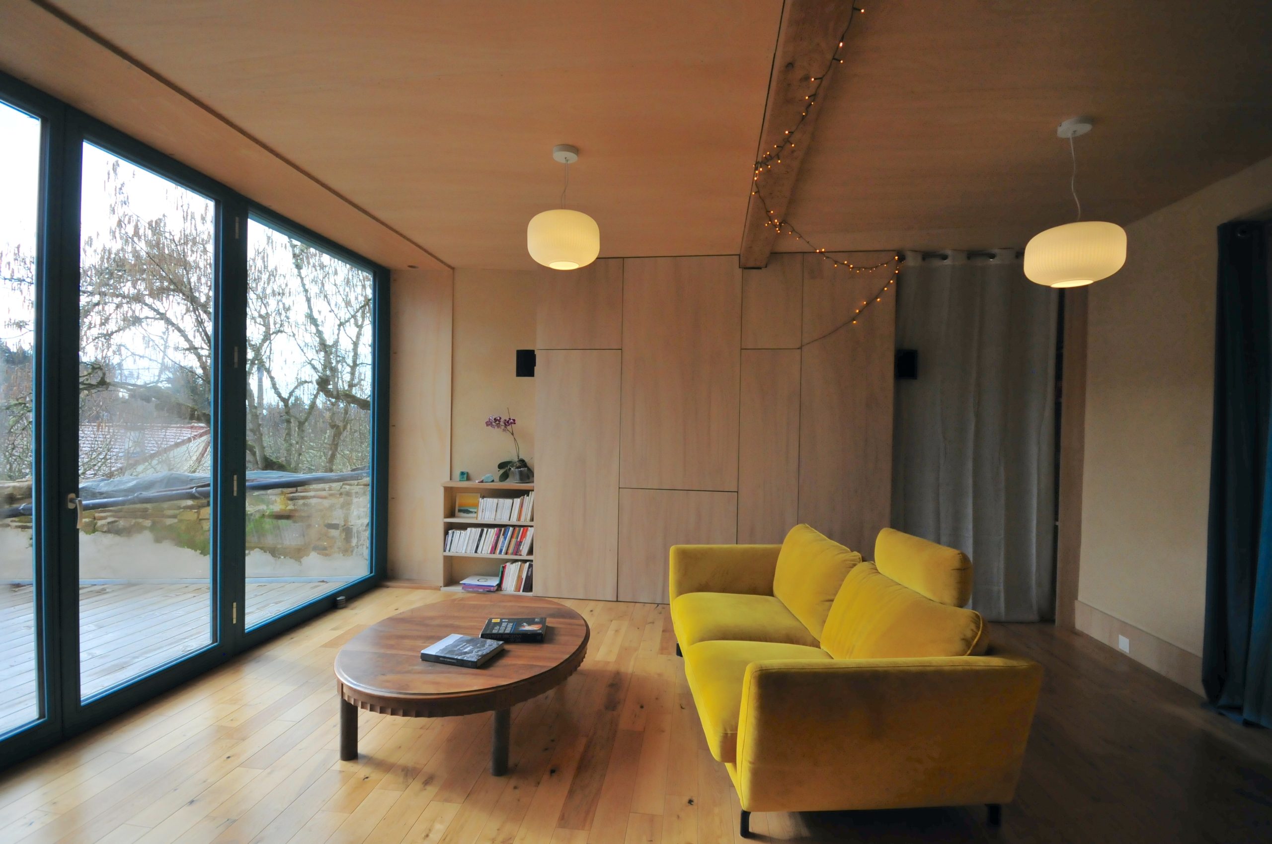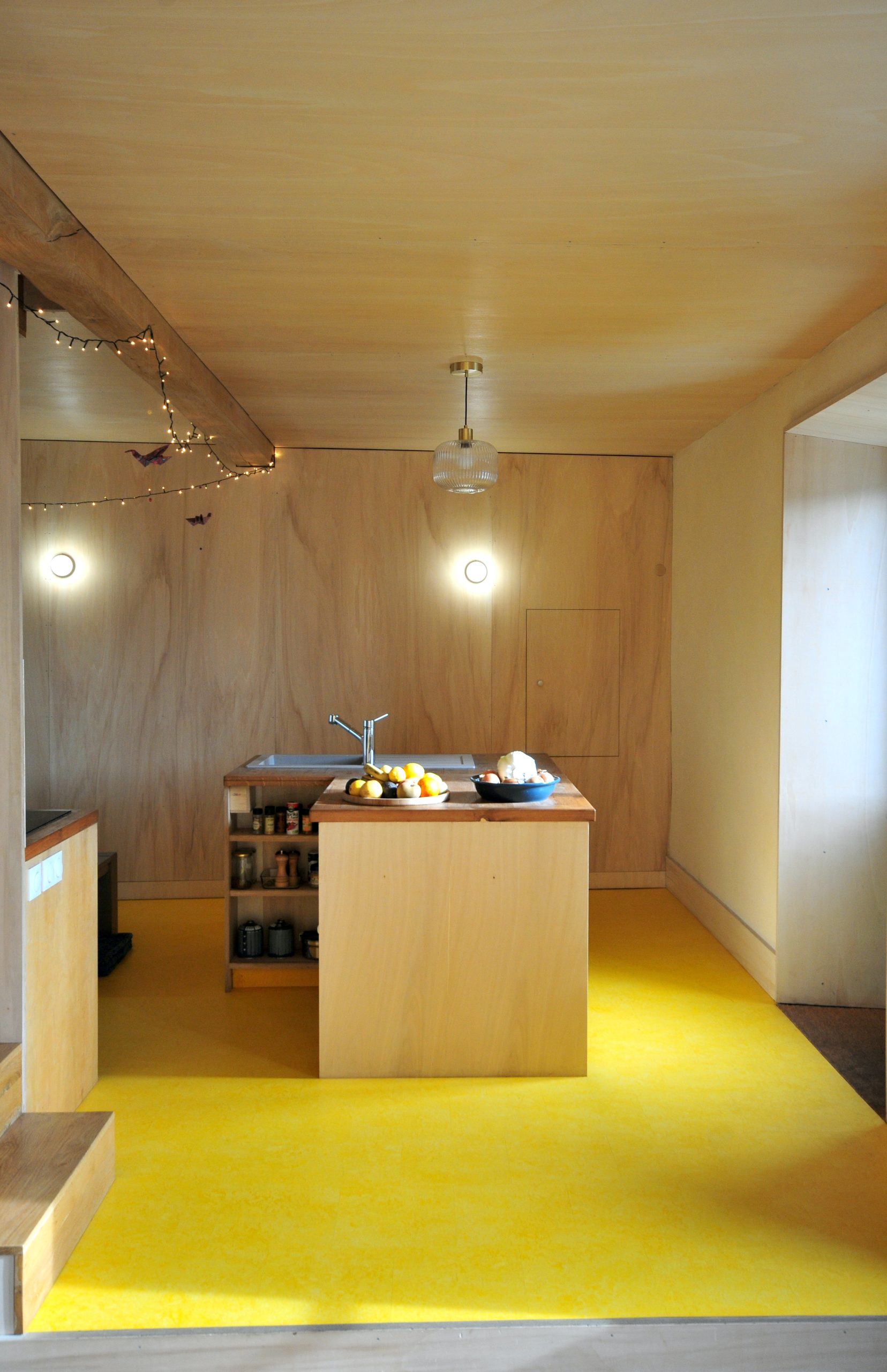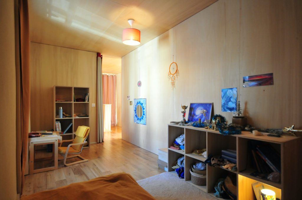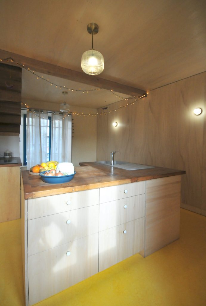 Finitions : contre-plaqué de peuplier, huile dure sur les plafonds, cloisons et le pignon / enduit poudre de marbre ou tuff – chaux aérienne sur les murs extérieurs / parquet chêne massif et linoléum dans la cuisine / enduit chaux aérienne – sable en façade.