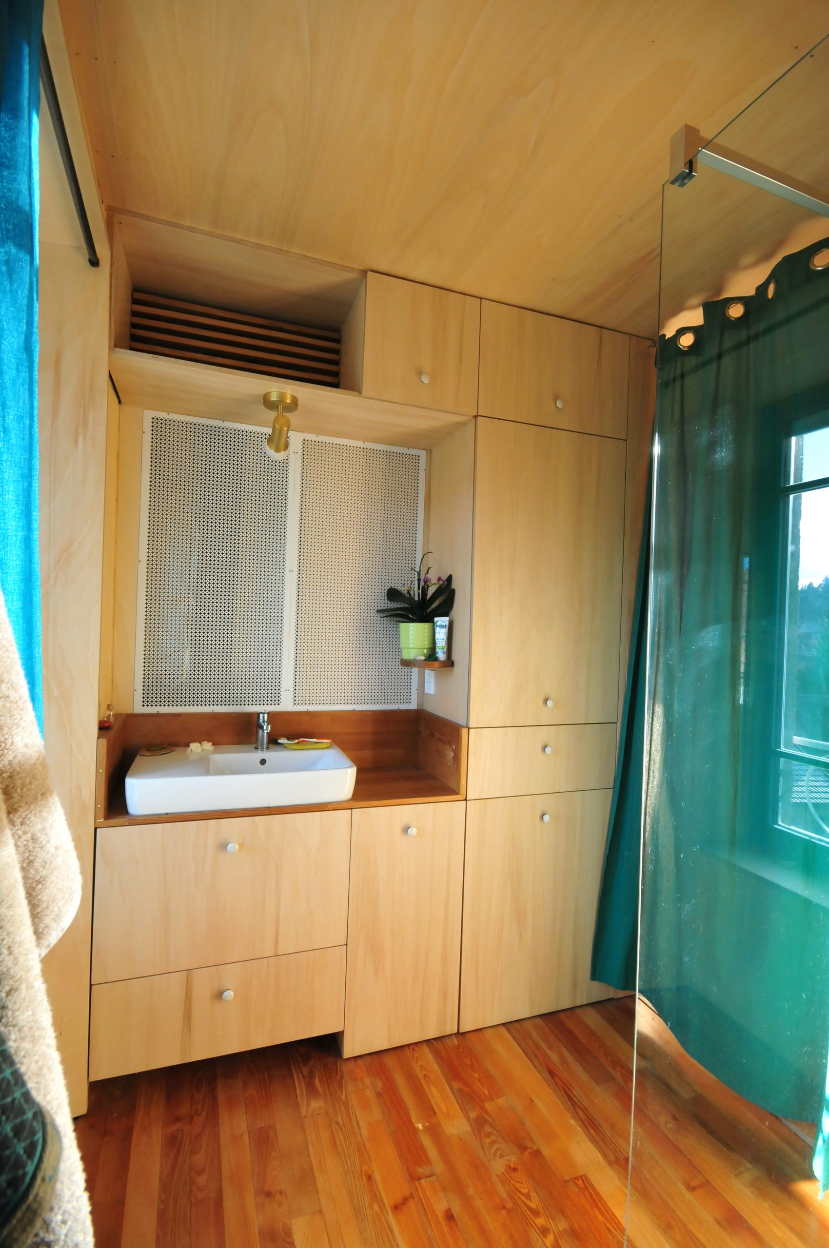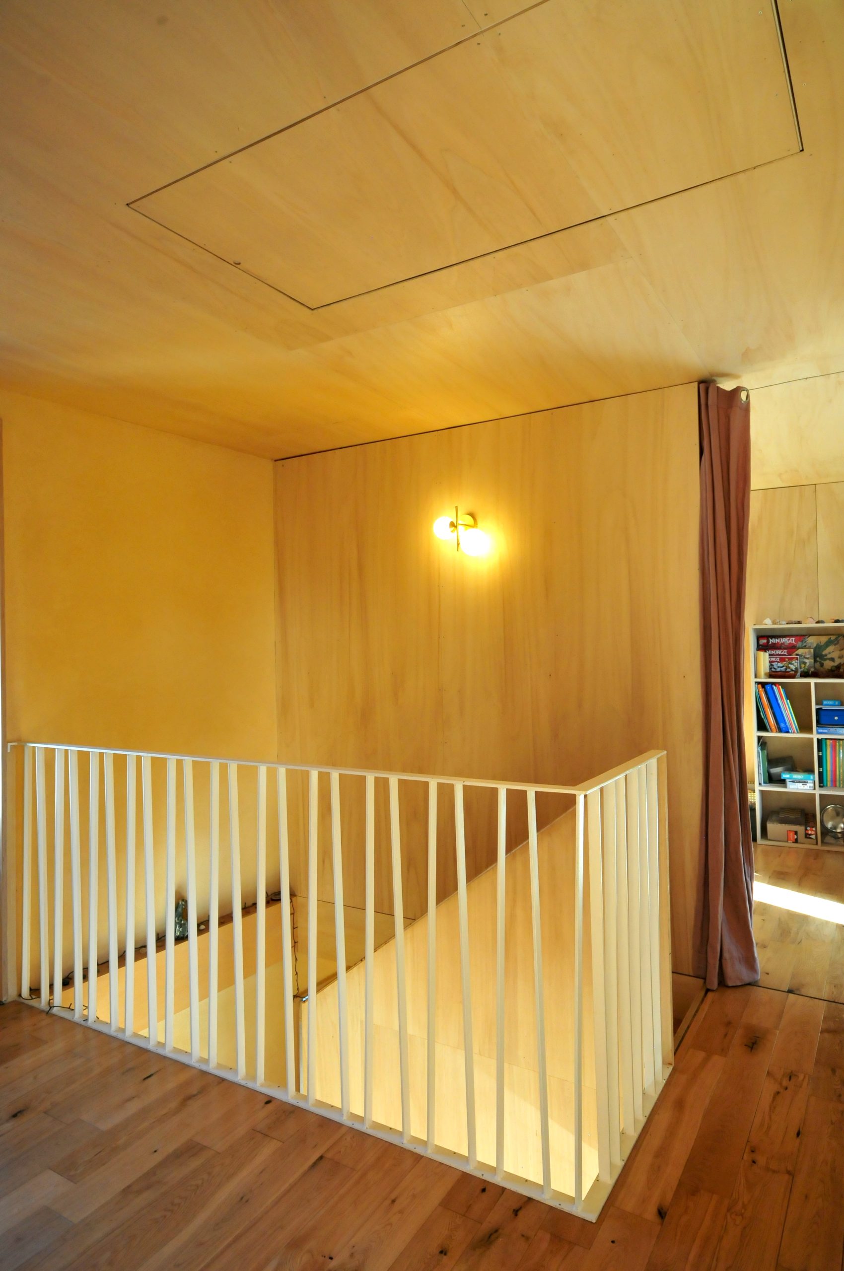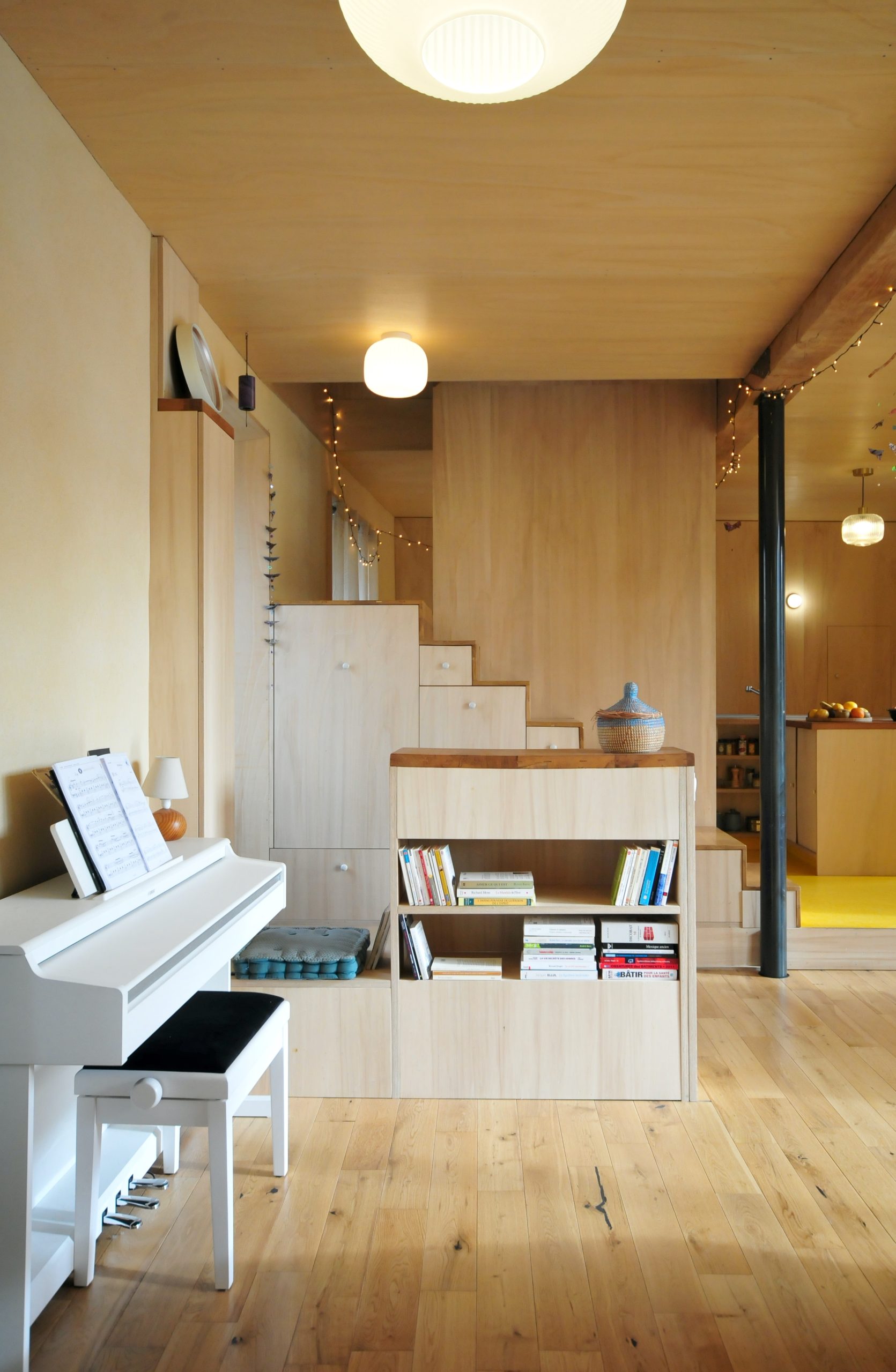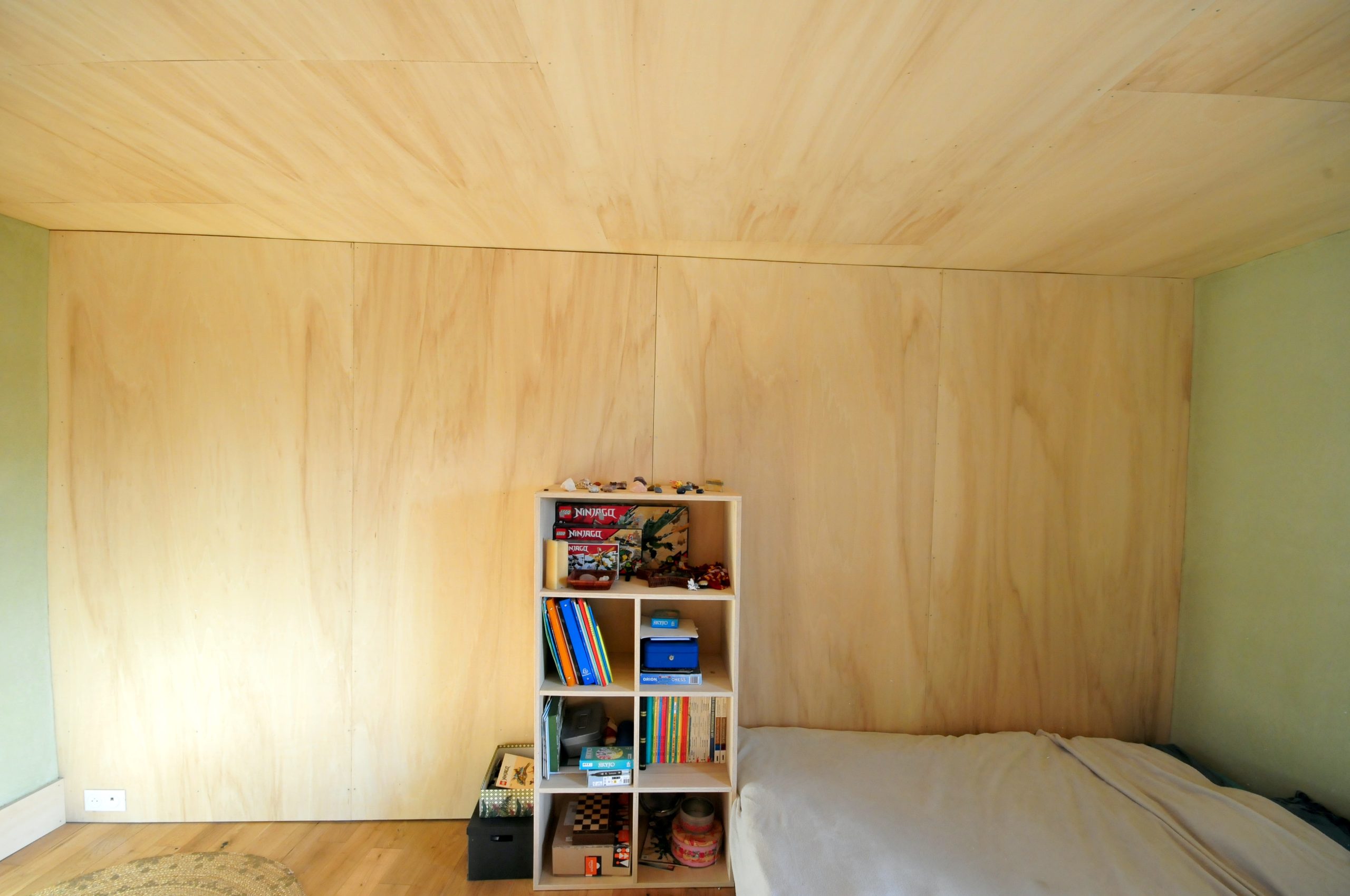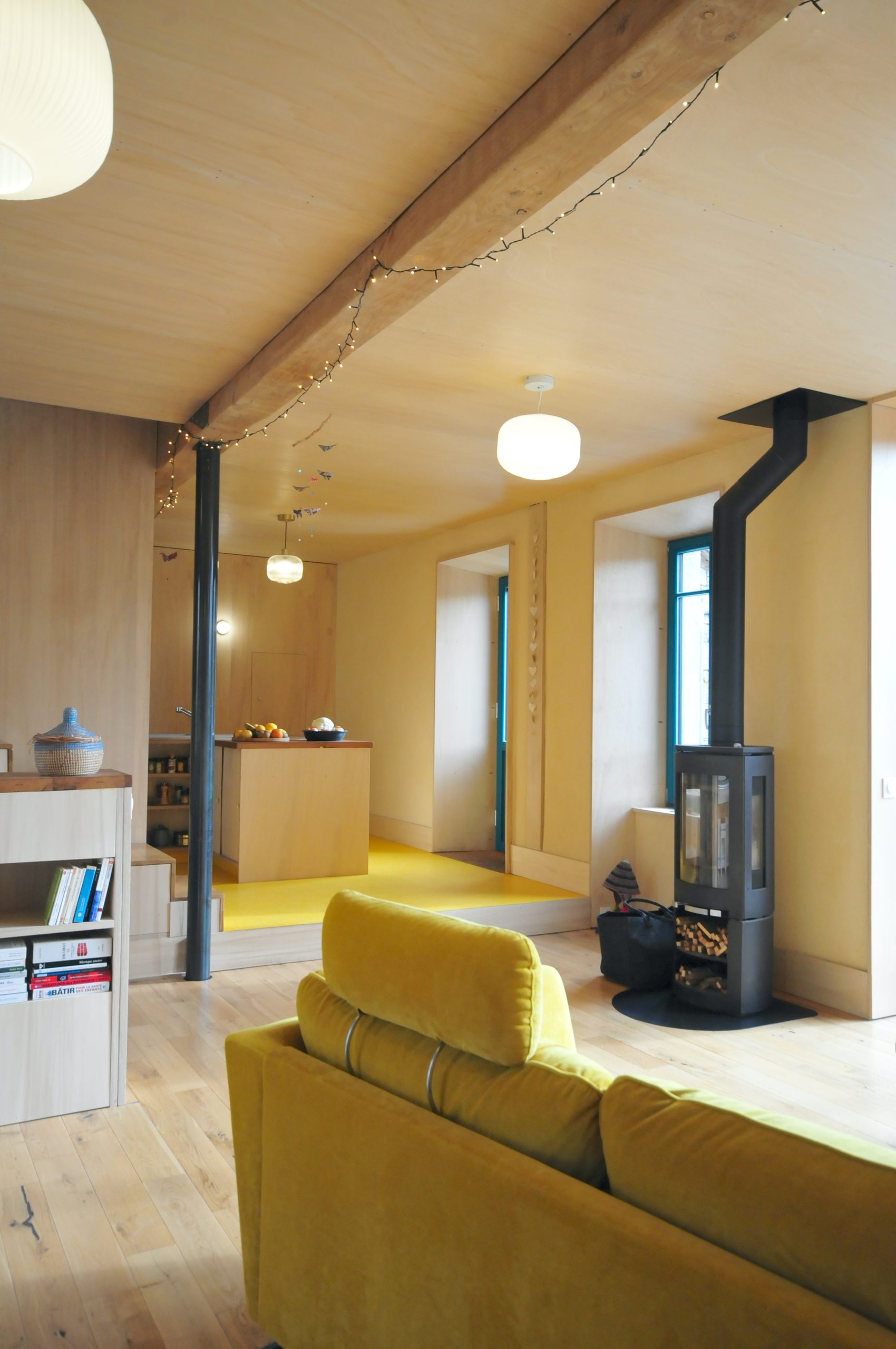 Finitions : contre-plaqué de peuplier, huile dure sur les plafonds, cloisons et le pignon / enduit poudre de marbre ou tuff – chaux aérienne sur les murs extérieurs / parquet chêne massif et linoléum dans la cuisine / enduit chaux aérienne – sable en façade.