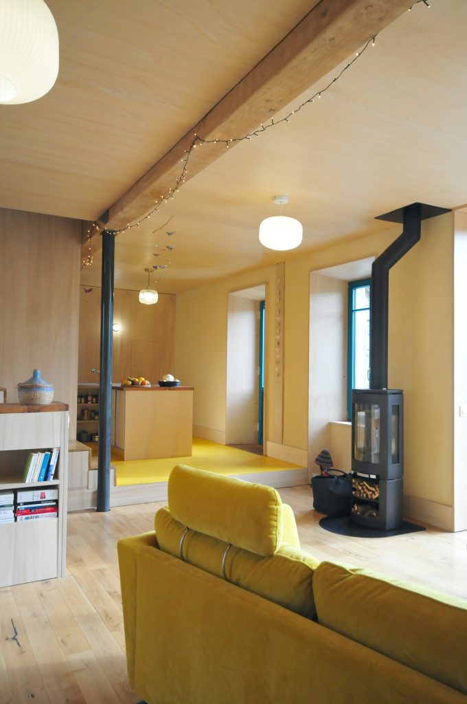 D’un point de vue spatial, l’intervention principale a consisté à démolir l’aile Sud-Est du bâtiment (2 pièces), excroissance accueillant probablement des ateliers. Ces deux pièces en enfilade n’étaient pas nécessaires au programme et leur disparition permet la création d’une très grande ouverture au Sud-Est modifiant complètement l’agrément du séjour qui désormais bénéficie d’une entrée de lumière et de soleil massive.