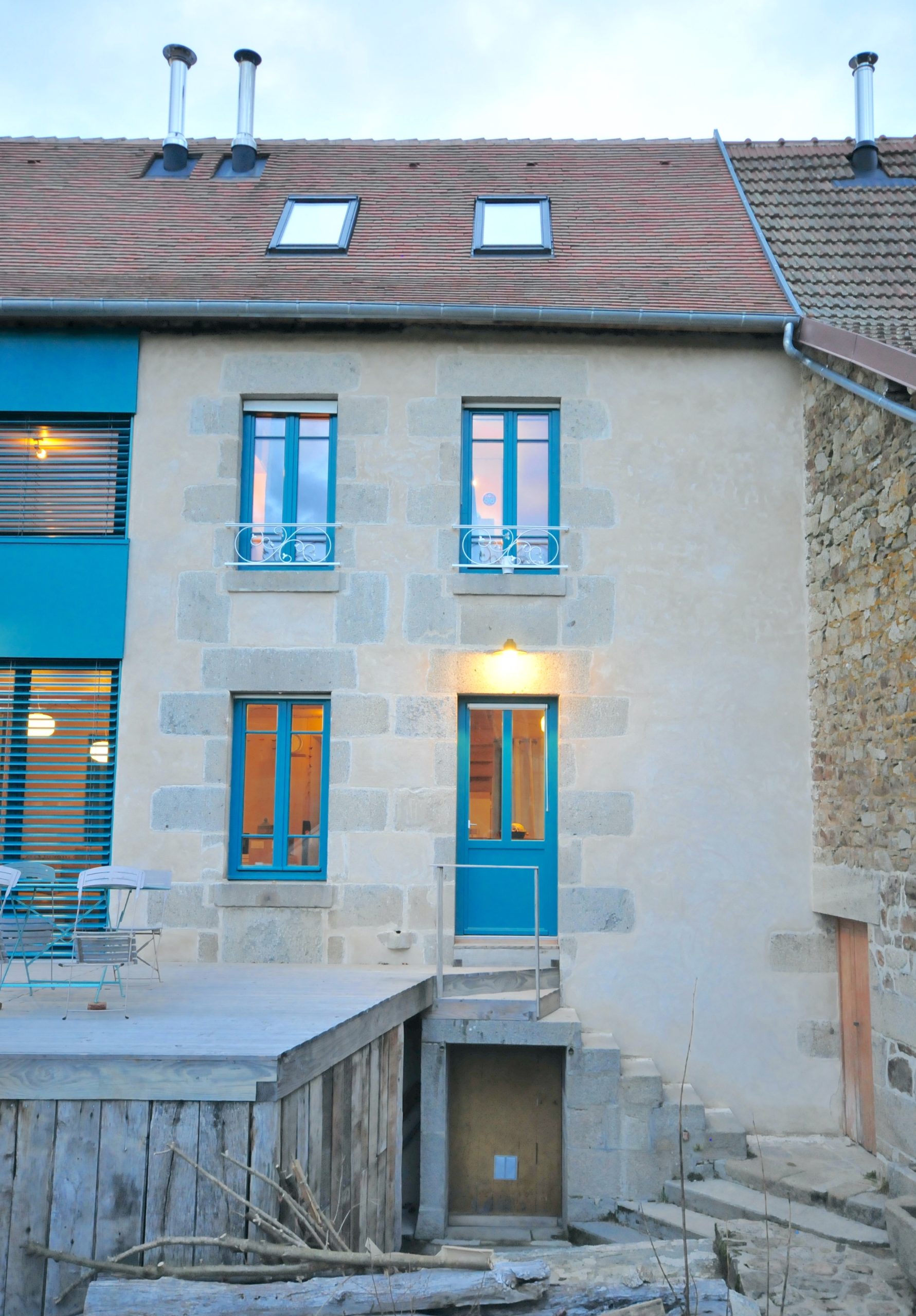 Typique maison « retour de migrant » Creusoise du XIXème située dans le quartier de Beaumont à Felletin. A l’unité d’habitation, est accolée une grange et une étable, l’ensemble aurait constitué une micro-ferme et/ou un relai de poste. La maçonnerie en granit est de belle facture (allèges de fenêtre d’un seul bloc, escalier, linteaux et poteaux monumentaux). La charpente en chêne est en bon état. Ces éléments sains et durables sont conservés, la couverture refaite en petites tuiles traditionnelles artisanales et les enduits extérieurs à la chaux aérienne affleurants aux pierres d’angle (en remplacement d’un enduit bâtard peint pathologique).